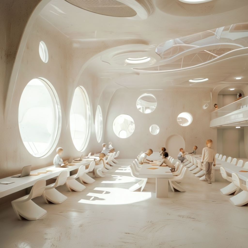 Що ж ми побачимо? Можливо, у такій школі в теплі дні більшість занять проходитиме на свіжому повітрі, у тіні великих дерев шкільного парку або на залитих сонцем галявинах під звук цвіркунів і шум морських хвиль. А в холодну пору навчання проводитимуть у світлих класах без дверей з виступами стін, які схожі на куліси, що заходять одна за одну.